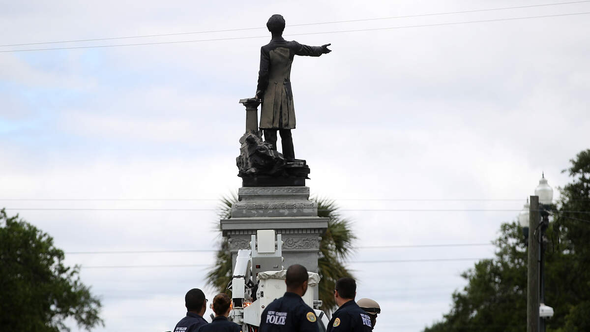 (Fox 8) A crane moved down Canal St. near the Jefferson Davis monument around 3 a.m. on Thursday as it appeared the statue would be taken down.