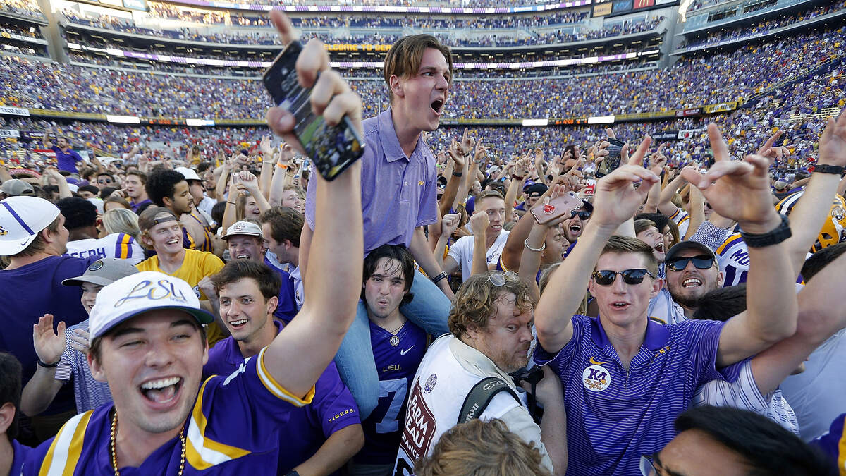 LSU Tigers students celebrate on the field after a game against the Georgia Bulldogs at Tiger Stadium on October 13, 2018 in Baton Rouge, Louisiana. LSU Tigers won 36-16. (Photo by Jonathan Bachman/Getty Images)