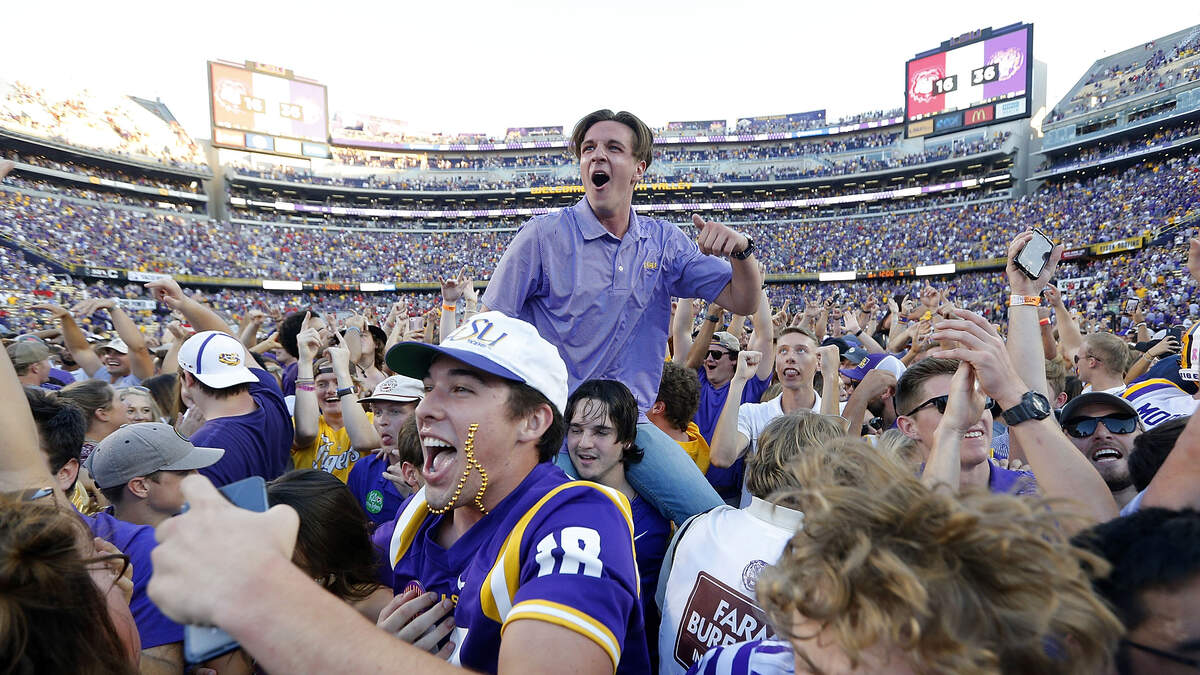 LSU Tigers students celebrate on the field after a game against the Georgia Bulldogs at Tiger Stadium on October 13, 2018 in Baton Rouge, Louisiana. LSU Tigers won 36-16. (Photo by Jonathan Bachman/Getty Images)