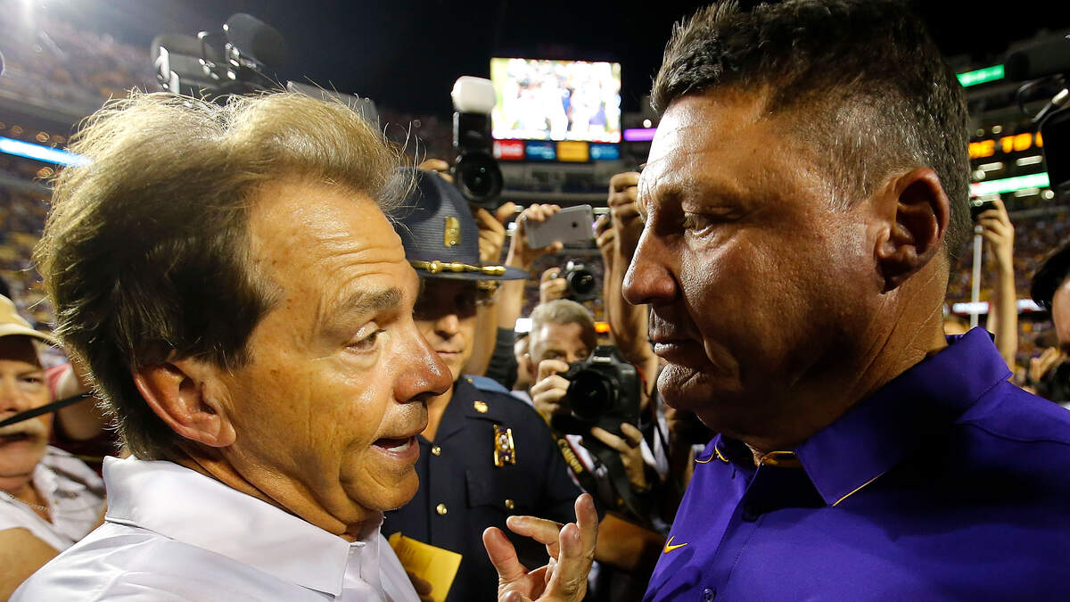 Head coach Nick Saban of the Alabama Crimson Tide shakes hands with head coach Ed Orgeron of the LSU Tigers after their 10-0 win at Tiger Stadium on November 5, 2016 in Baton Rouge, Louisiana. (Photo by Kevin C. Cox/Getty Images)
