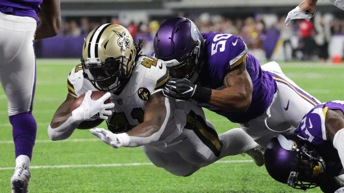 Alvin Kamara #41 of the New Orleans Saints dives with the ball into the end zone for a touchdown in the first quarter of the game against the Minnesota Vikings at U.S. Bank Stadium on October 28, 2018 in Minneapolis, Minnesota. (Photo by Adam Bettcher/Getty Images)
