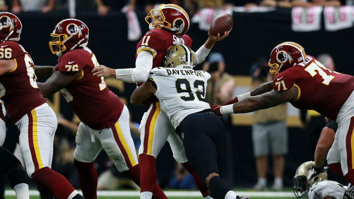 Alex Smith #11 of the Washington Redskins is pressured by Marcus Davenport #92 of the New Orleans Saints during the first half at the Mercedes-Benz Superdome on October 8, 2018 in New Orleans, Louisiana. (Photo by Sean Gardner/Getty Images)