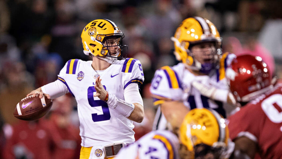 Joe Burrow #9 of the LSU Tigers throws a pass under pressure in the first half of a game against the Arkansas Razorbacks at Razorback Stadium on November 10, 2018 in Fayetteville, Arkansas. (Photo by Wesley Hitt/Getty Images)