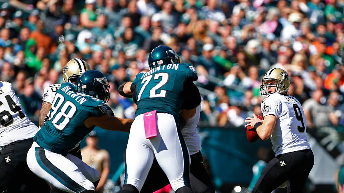 Quarterback Drew Brees #9 of the New Orleans Saints in action against the Philadelphia Eagles in the second quarter during a football game at Lincoln Financial Field on October 11, 2015 in Philadelphia, Pennsylvania. (Photo by Rich Schultz /Getty Images)