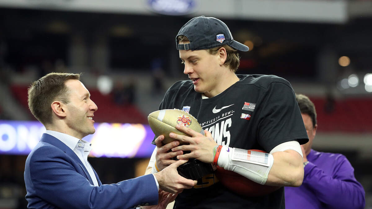 Burrow was slow getting up after being blindsided by 313-pound defensive lineman Joey Connors on an interception return for a touchdown in the first quarter. LSU's junior quarterback returned to the game and picked apart UCF's secondary, hitting 21 of 34 of passes, including two touchdowns to Justin Jefferson.
