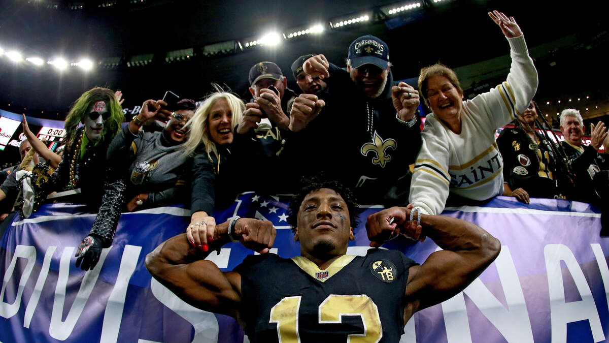 Michael Thomas #13 of the New Orleans Saints posses for a photo with the fans after his teams win over the Philadelphia Eagles in the NFC Divisional Playoff Game at Mercedes Benz Superdome on January 13, 2019 in New Orleans, Louisiana. The Saints defeated the Eagles 20-14. (Photo by Sean Gardner/Getty Images)