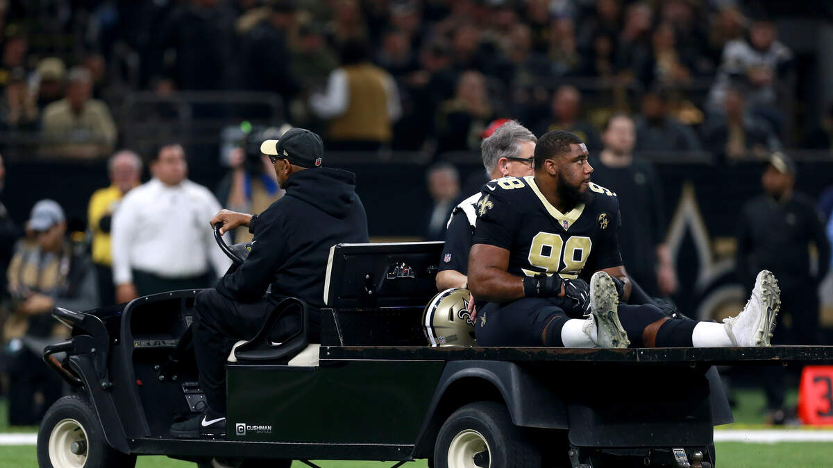 Sheldon Rankins #98 of the New Orleans Saints is carted off the field after sustaining an injury during the first quarter against the Philadelphia Eagles in the NFC Divisional Playoff Game at Mercedes Benz Superdome on January 13, 2019 in New Orleans, Louisiana. (Photo by Sean Gardner/Getty Images)