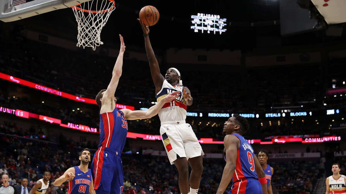 Jrue Holiday #11 of the New Orleans Pelicans shoots the ball over Jon Leuer #30 of the Detroit Pistons at Smoothie King Center on January 23, 2019 in New Orleans, Louisiana. (Photo by Chris Graythen/Getty Images)