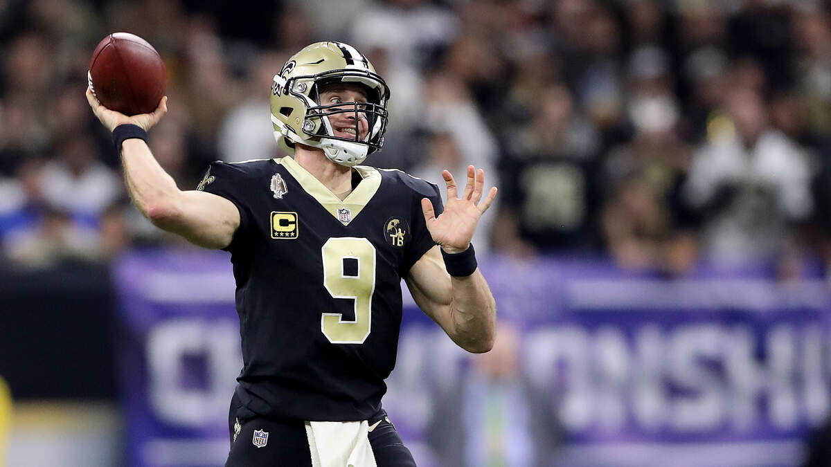 Drew Brees #9 of the New Orleans Saints throws a pass against the Los Angeles Rams during the fourth quarter the NFC Championship game at the Mercedes-Benz Superdome on January 20, 2019 in New Orleans, Louisiana. (Photo by Streeter Lecka/Getty Images)