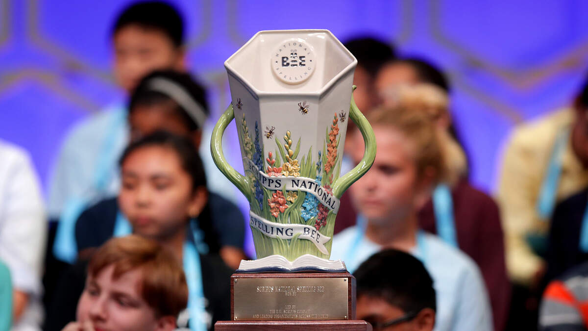 The championship trophy for the Scripps National Spelling Bee stands on stage with competitors at the Gaylord National Resort & Convention Center May 28, 2019 in National Harbor, Maryland. Students from across the country and around the world compete in the spelling competition, which started in 1925. (Photo by Chip Somodevilla/Getty Images)