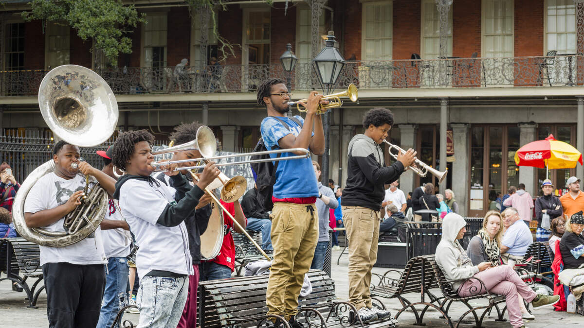 They took to Frenchman Street Sunday, two weeks after trumpeter Eugene Grant was held to the ground by a New Orleans police officer and arrested after a complaint of the band playing in front of a bookstore.