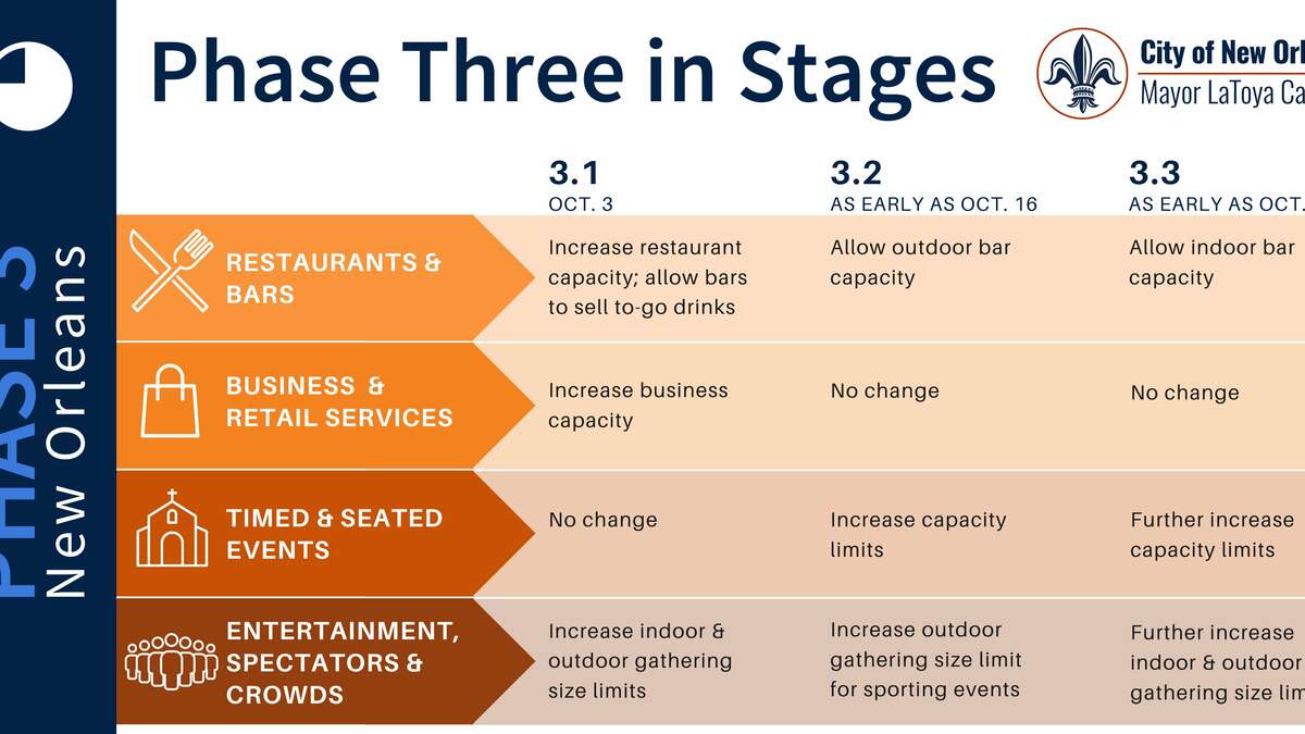 (WVUE/FOX 8) The City of New Orleans is moving into the first three stages of Phase 3, according to Mayor LaToya Cantrell.