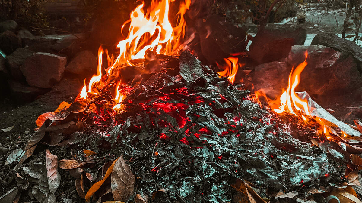 Garbage pile of dry leaves on fire