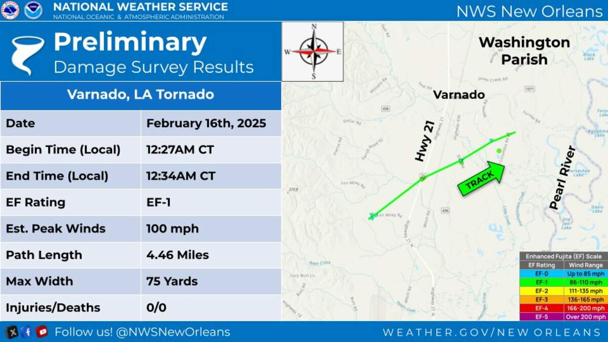 The National Weather Service is confirming that an EF-1 tornado passed through Washington Parish early Sunday morning.