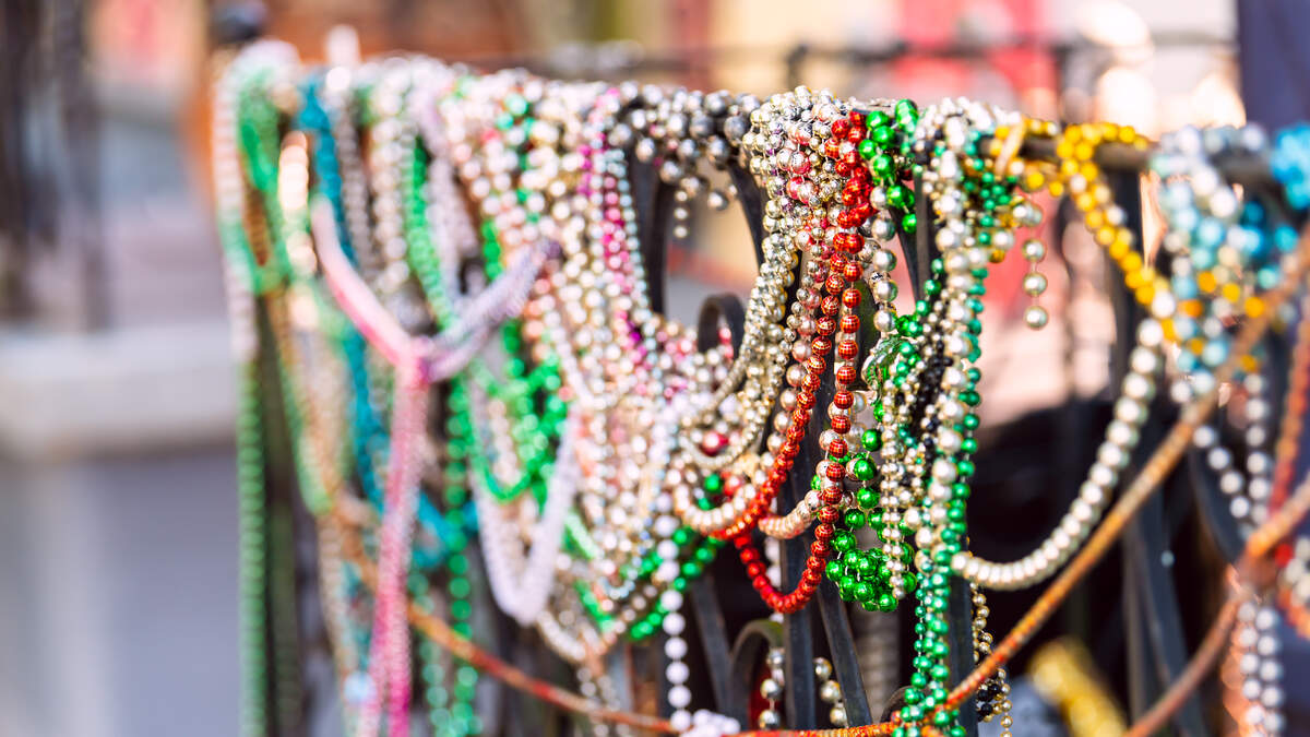 New Orleans, USA closeup of mardi gras beads hanging on fence by colorful building house and nobody on sidewalk