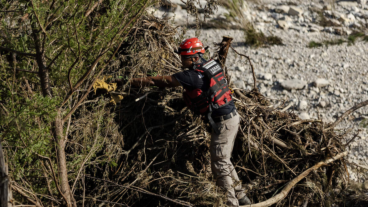A member of a search and rescue team checks debris for any survivors or remains of the deceased on the bank of the Guadalupe River on July 8, 2025 in Center Point, Texas. Photo: Jim Vondruska / Getty Images News / Getty Images