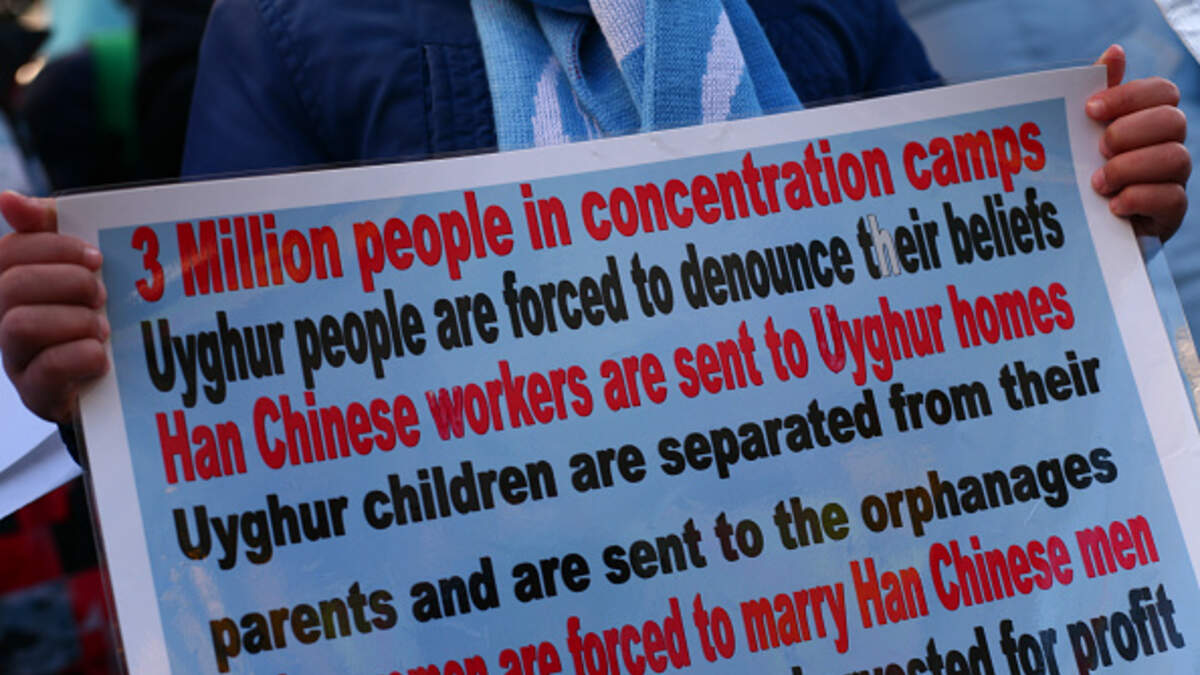 Uighur rights activists rally in solidarity with the pro-democracy movement in Hong Kong and in protest at China's treatment of its Tibetan and Uighur peoples at a demonstration for all three causes outside the Chinese Embassy in London, England, on January 19, 2020. In its newly-released 'World Report 2020', New York-based research and advocacy NGO Human Rights Watch last week singled-out 'deepening repression' by Chinese authorities during 2019, including of religious freedoms in Tibet and in the Uighur homeland of Xinjiang, as the defining feature of what was the 70th anniversary year of the Chinese Communist Party. (Photo by David Cliff/NurPhoto via Getty Images)